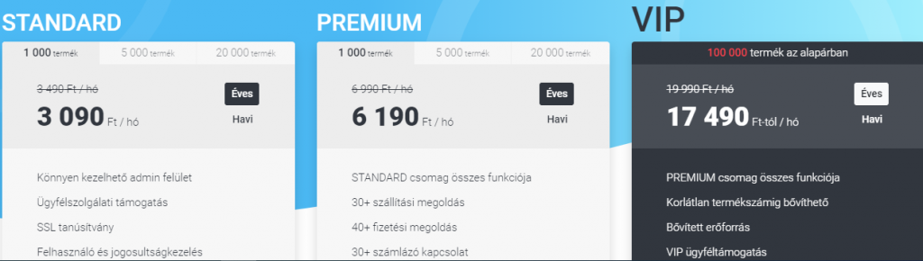 Ami viszont nem jár az alap csomaghoz, az a beépített API bármilyen külső program illesztéséhez. Ez a kényelmi megoldás csak a prémium vagy a VIP előfizetéseknél elérhető. Mindegyik csomag esetében felár ellenében rendelhető domain és e-mail cím az áruházhoz.