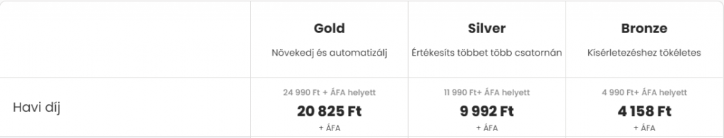 A másik magyar cég a Shoprenter, ami egy kicsit a Shopify-ra hajaz, ez is felhő alapú rendszer. Kicsit magasabb árakkal dolgozik, mint az UNAS, de éves díjfizetést választva, akár két hónap díját is megspórolhatod. 4 csomag közül választhatsz. Fix díja csak a Bronze, Silver és Gold csomagoknak van, a Platinum csomag egyedi árképzés alá esik. Az árak a következőképpen alakulnak éves díjfizetés esetén: