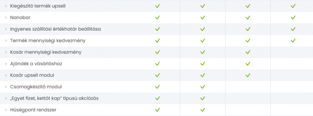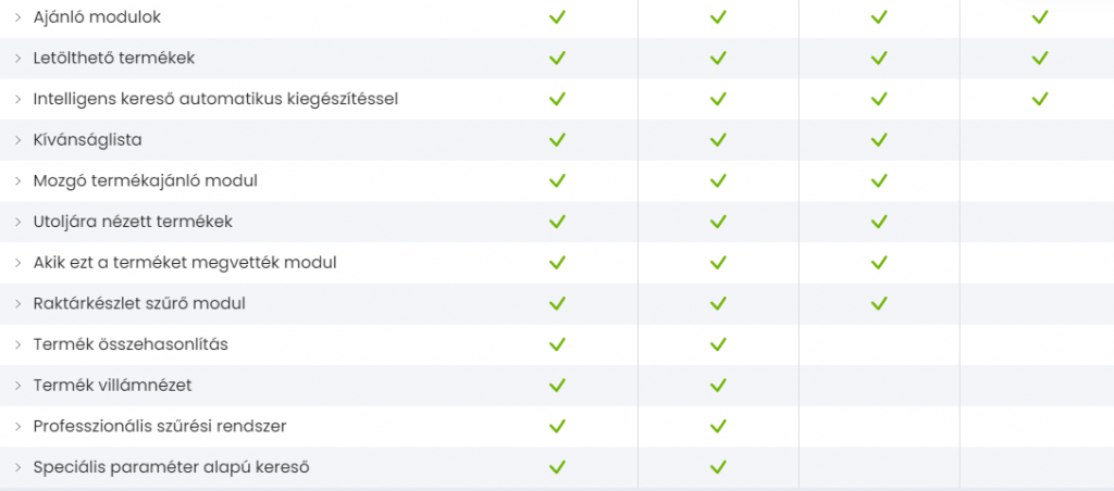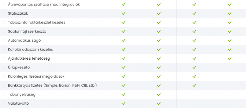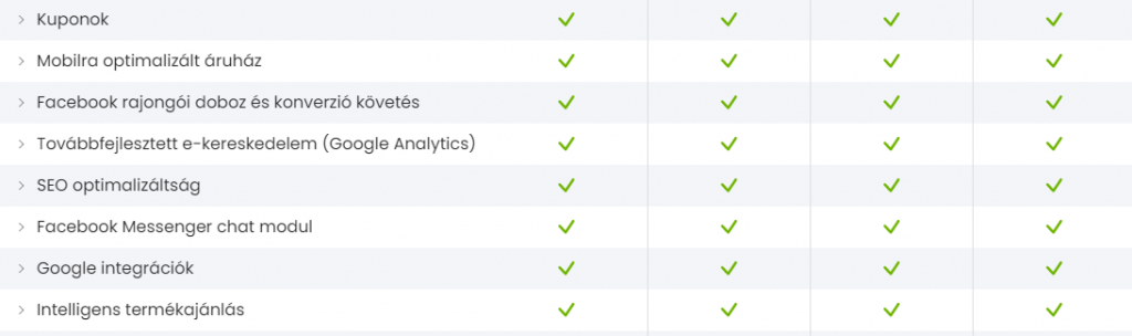 A képen látható összes funkció az összes csomag esetében elérhető a Shoprenternél. Az UNAS kínálatával összehasonlítva annyi különbséget látunk, hogy a kuponrendszer és az intelligens termékajánlás itt már az alapcsomagban is rendelkezésre áll.