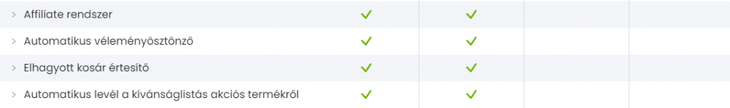 Ezek a marketing funkciók a két szolgáltatónál mondhatni, hogy teljesen megegyeznek, az olyan extra modulok, mint az „Egyet fizet kettőt kap” típusú akciózás, vagy az Ajándék a vásárláshoz funkció mindkettőnél csak magasabb előfizetői csoport esetén érhető el.