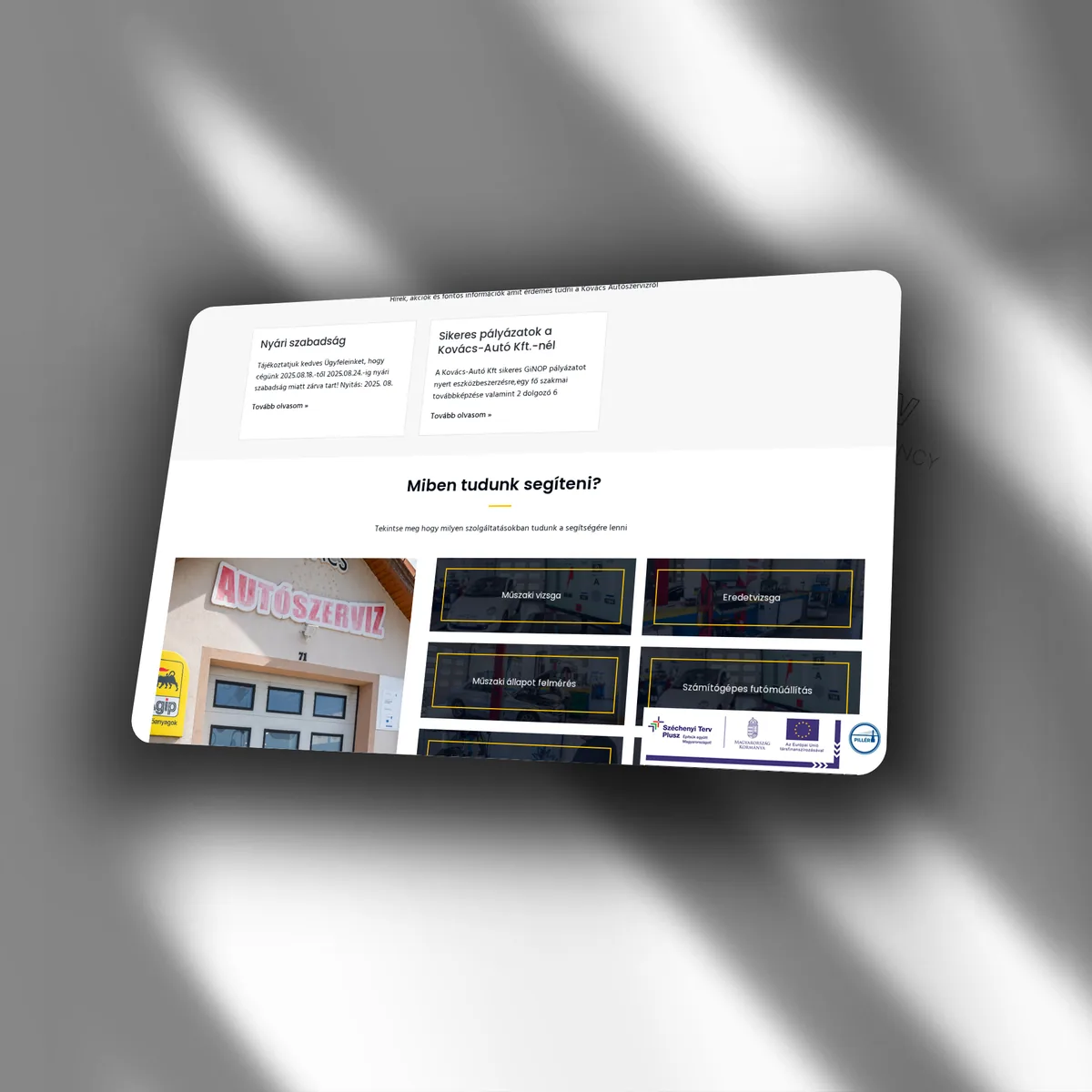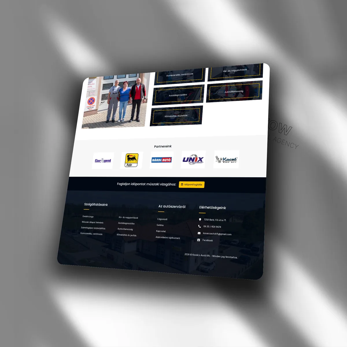 Funkcionális, gyorsan áttekinthető weboldalt, ahol a szolgáltatások (szerviz, vizsga, diagnosztika) azonnal megtalálhatók. Az online időpontfoglaló rendszer csökkenti a telefonos egyeztetést. A partneri logók és a galéria bizalmat épít — a helyi vállalkozásoknál ez különösen fontos. Az aktualitások szekció szezonális akciókat és tudnivalókat kommunikál.