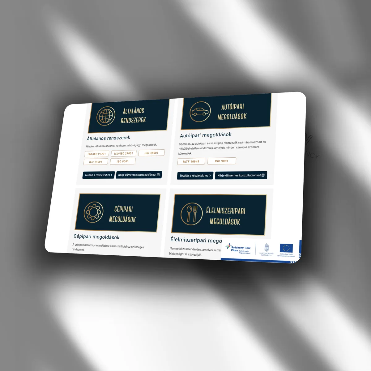 WordPress + Elementor · Kétnyelvű felület · Iparág-specifikus aloldalak · Tanúsítvány- és referencia-kezelő · Hírek/blog szekció · Kapcsolatfelvételi űrlap · Reszponzív megjelenés