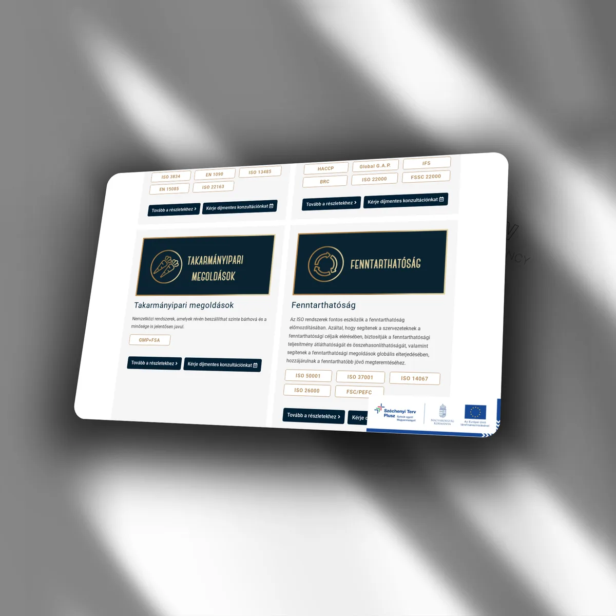 Iparágak szerint rendezett struktúrát: autóipar, gépipar, élelmiszeripar, takarmányipar, erdőgazdálkodás és fenntarthatóság — mindegyik saját bemutató résszel. A tanúsítványok és referenciák szekció a szakmai hitelességet erősíti. A hírek rovat iparági aktualitásokat közvetít, ami SEO-szempontból is értékes. A kétnyelvű felépítés a nemzetközi ügyfeleket is kiszolgálja.