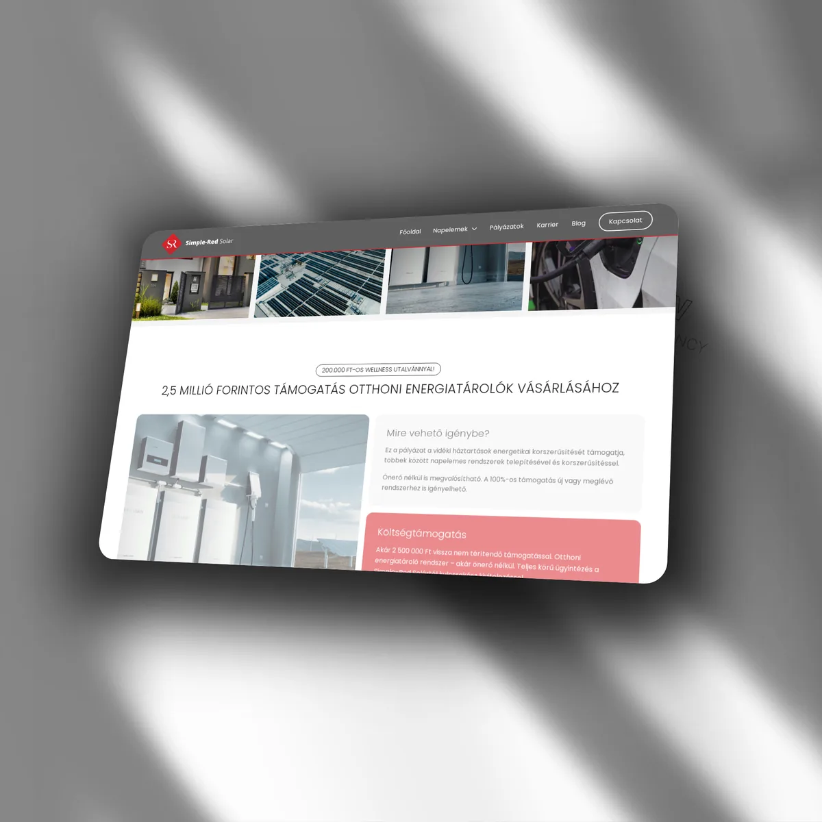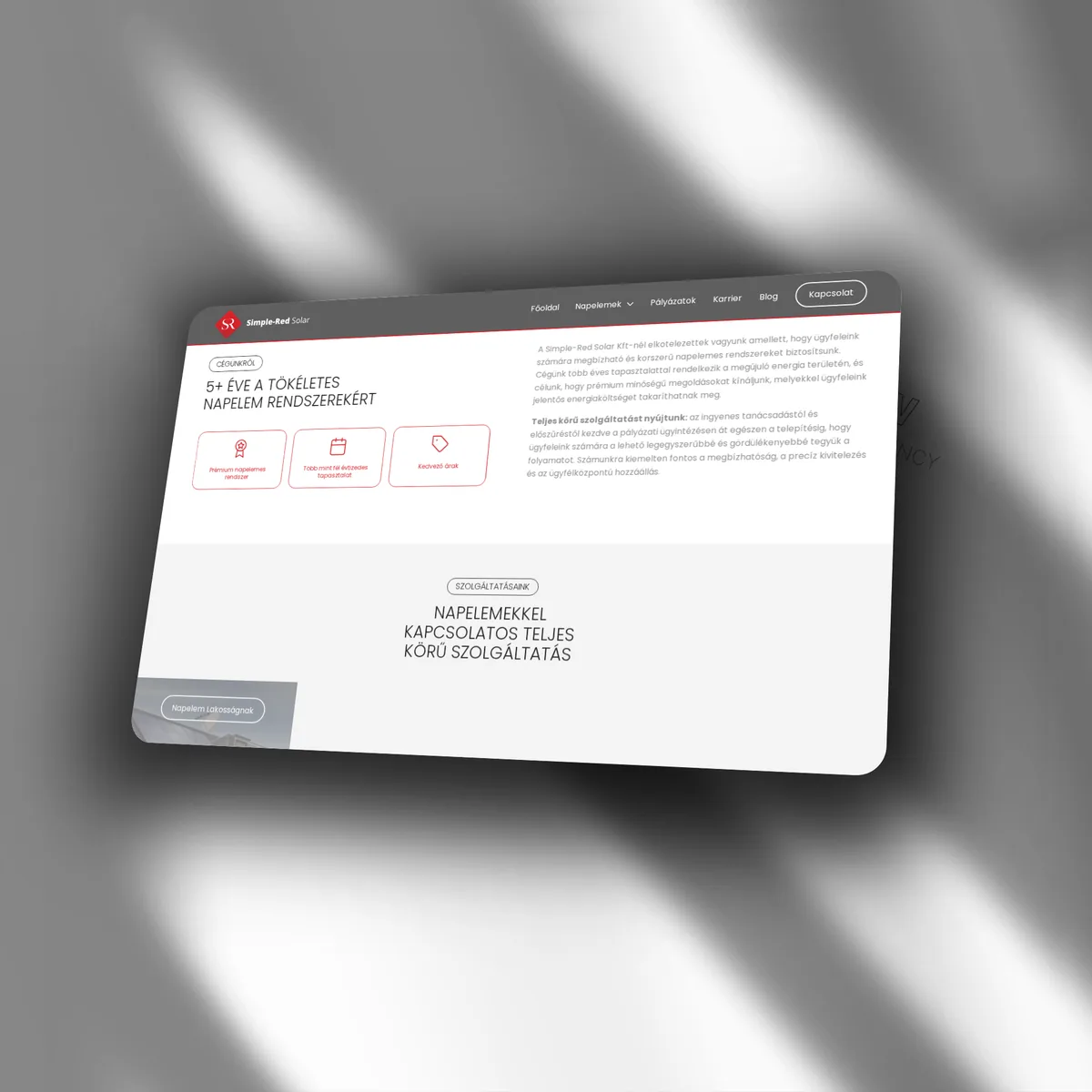 A Simple Red Solar lakossági és vállalati napelem rendszereket telepít, energiatárolókat és e-töltőket forgalmaz. Komplex, többoldalas webhely kellett, amely a különböző célcsoportokat (magánszemély, cég) külön-külön szólítja meg és pályázati tájékoztatást is nyújt.
