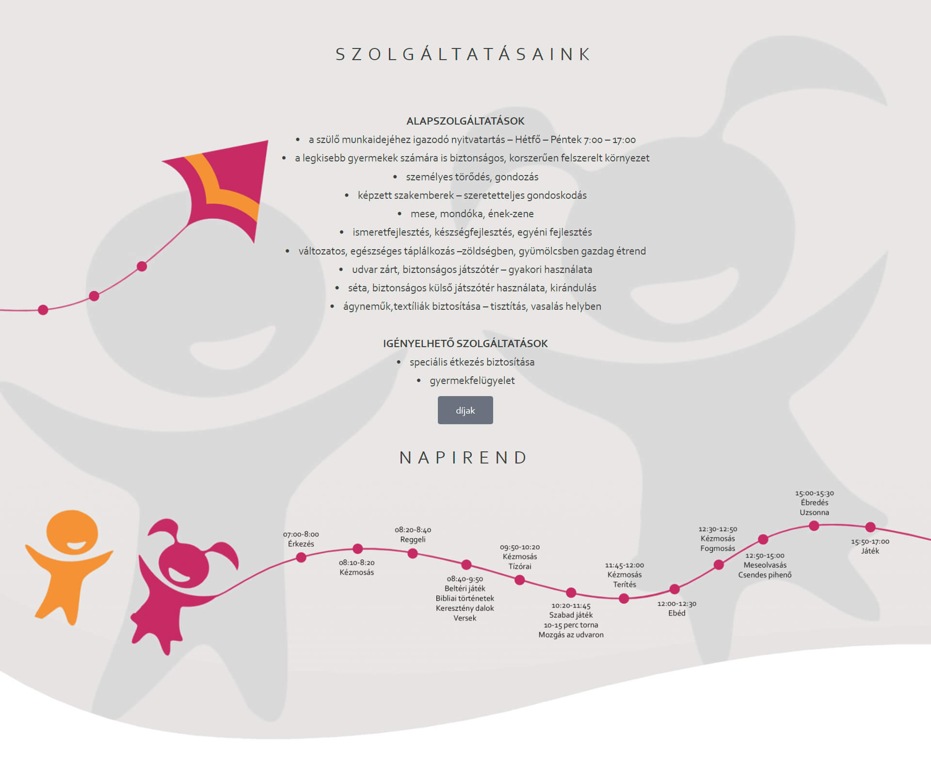A családi bölcsőde azon családok számára nyújt minőségi szolgáltatást, akik fontosnak tartják, hogy gyermekük felügyeletét keresztény értékrendet képviselő szakember lássa el. Fontosnak tartottuk, hogy bemutassuk a kisgyermekek számára a biztonságot nyújtó, szeretetteljes légkört, ami nem más, mint a Kerekerdő Családi Bölcsőde. A menüpont alatt szerepelnek a bölcsődei alapszolgáltatások, fotók, jelentkezési lehetőségek is.