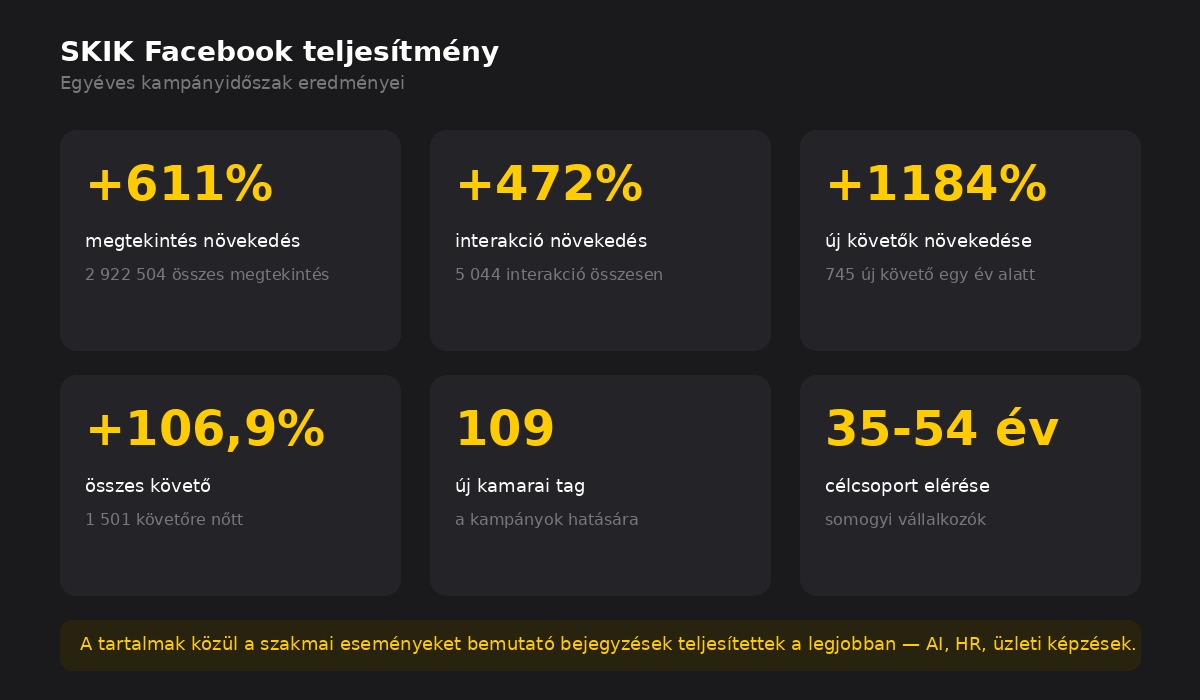 2 922 504 megtekintés (+611% növekedés), 5 044 interakció (+472%), 745 új követő egy év alatt (+1184%), és 109 új vállalkozó kezdeményezte az önkéntes kamarai taggá válást a kampányok hatására. A közönség döntő része somogyi vállalkozókból és üzleti szereplőkből áll, a követők többsége a 35-54 éves korosztályból — pontosan a kamara célcsoportja.